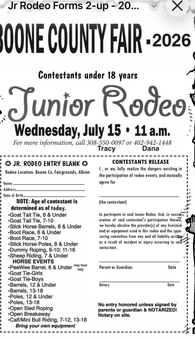 Jr. Rodeo Wednesday, July 15, 2026 11:00 AM 1:00 PM Boone County Fairgrounds 11th St. and Fairview Albion, NE US (map) Google Calendar ICS